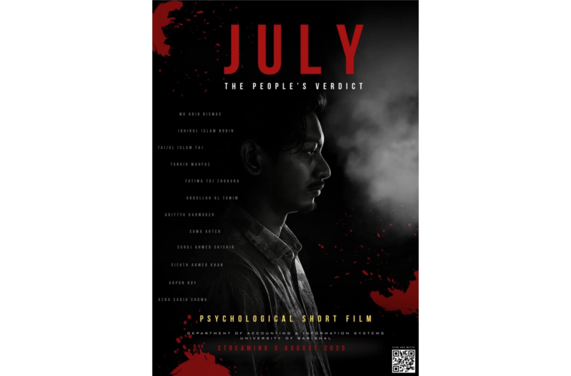 ২০২৪ সালের জুলাই মাসে ঘটে যাওয়া ছাত্র আন্দোলনের মানসিক অভিঘাত ও সামাজিক প্রতিফলনকে কেন্দ্র করে একটি সাইকোলজিকাল থ্রিলার স্বল্পদৈর্ঘ্য চলচ্চিত্র নির্মাণ করেছে বারিশাল বিশ্ববিদ্যালয়ের একাউন্টিং এন্ড ইনফরমেশন সিস্টেমস্ বিভাগের শিক্ষার্থীরা।