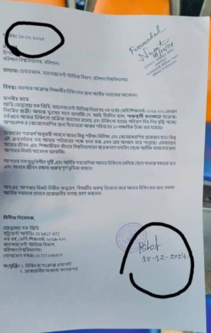 অভিযোগটি খতিয়ে দেখতে গিয়ে দেখা যায়, ২০২৩ সালে প্রথম জিমির পাখস্থলিতে ক্যান্সার ধরা পরার পর থেকে জিমির পরিবারই তার সকল চিকিৎসা খরচ বহন করে আসছিল। তবে জিমির কোন ভাই না থাকায় তার বাবার একার পক্ষে এই ব্যায়ভার বহন করা সম্ভব হচ্ছিল না। তারই পেক্ষিতে গতবছর ২০২৪ সালের ১৮ ডিসেম্বর একটি আর্থিক সাহায্যে আবেদন ম্যানেজমেন্ট স্টাডিজ বিভাগের তৎকালীন চেয়ারম্যান নুসরাত শারমিন লিপির মাধ্যম হয়ে বরিশাল বিশ্ববিদ্যালয়ের ভিসি দপ্তরে পাঠানো হয়। যা ভিসি দপ্তরের কর্মকর্তা রাহাত কতৃক রিসিভ করা হয় বলে আবেদনের রিসিভ কপিতে দেখা যায়। জানা যায়, এর পর থেকে তাদের প্রতিনিয়ম নতুন নতুন সময় দেওয়া হতো উপাচার্যের সাথে দেখা করার জন্য। বারবার সময় দিয়ে দেখা না করাই ওই শিক্ষার্থী পুনরায় বিভাগীয় চেয়ারম্যান ড. আব্দুল্লাহ আল মাসুদের মাধ্যমে আবারো আবেদন করেন। কিন্তু তারপরও কিছুতেই বরিশাল বিশ্ববিদ্যালয়ের উপাচার্যের সাক্ষাৎ পান নি ওই শিক্ষার্থী।
